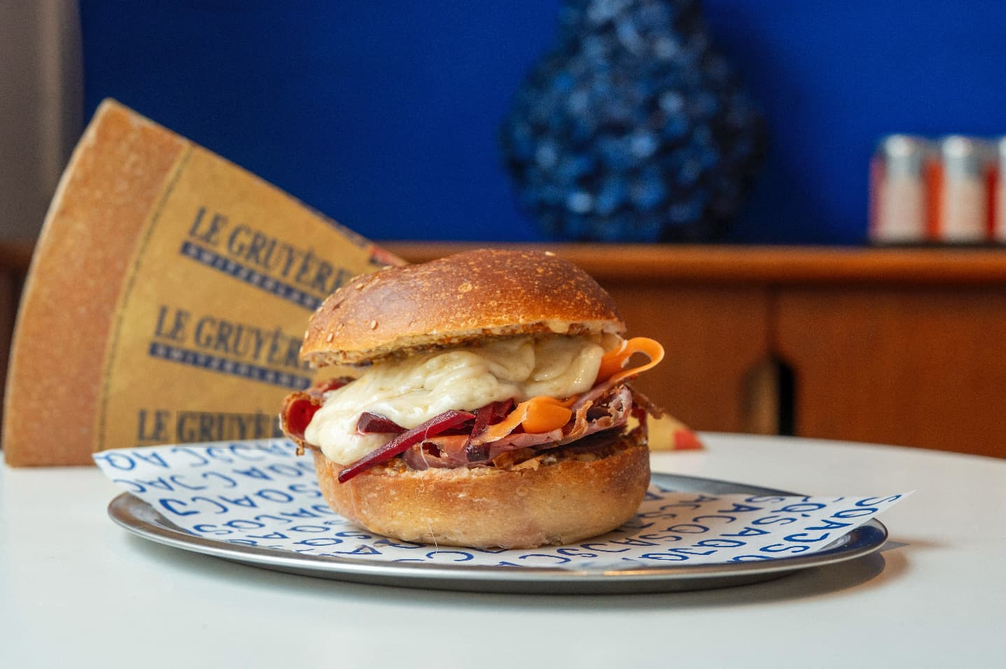 Bun façon “Challah” au Gruyère AOP, pastrami et pickles