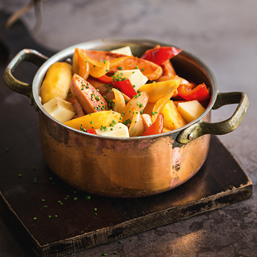 Goulash de cervelas avec pain croustillant façon Tilsit.